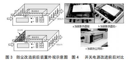 3.2在裝置本體進(jìn)風(fēng)孔加防塵網(wǎng),防止灰塵進(jìn)入裝置內(nèi)部,設(shè)備維護人員定期對濾網(wǎng)進(jìn)行清掃,從而減輕元器件表面覆塵,利于裝置正常散熱,如圖3所示加裝防塵網(wǎng)后開關(guān)電源示意圖。對裝置實施上述改進(jìn)后,其改進(jìn)前后對比如圖4所示。