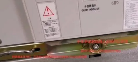 1,斷路器在分閘已儲能狀態,儲能指示顯示已儲能,儲能彈簧已拉開,面板得合閘按鈕在上圖中的下孔中,如果斷路器未儲能是合不了閘的