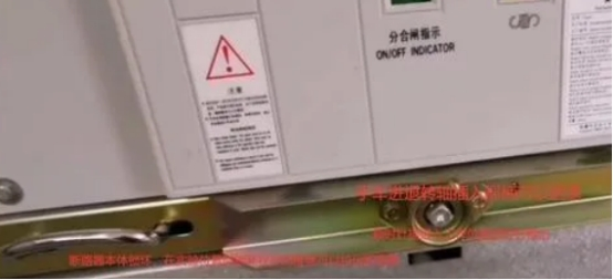 6,上圖為斷路器本體鎖環(huán),圖中為斷路器試驗(yàn)方位,從檢修方位推入試驗(yàn)方位時(shí),把兩頭鎖環(huán)往中心推把鎖環(huán)翻開(kāi),推入到試驗(yàn)方位時(shí),松開(kāi)鎖環(huán)鎖環(huán)就翻開(kāi)鎖在試驗(yàn)方位,當(dāng)要從試驗(yàn)方位推入到工作方位時(shí),將兩頭鎖環(huán)往中心推翻開(kāi)鎖環(huán),這時(shí)順時(shí)針搖入斷路器到工作方位。