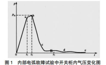 內(nèi)部故障發(fā)生的損壞力與電弧發(fā)生的距離容積,電弧電壓,繼續(xù)的時刻,短路電流巨細(xì)有關(guān)。在電弧發(fā)生后,柜體內(nèi)的壓力進(jìn)程如圖1所示,壓力進(jìn)程能夠分為四個物理階段風(fēng)圖1。