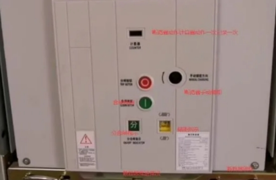 1,斷路器在分閘已儲(chǔ)能情況,儲(chǔ)能指示閃現(xiàn)已儲(chǔ)能,儲(chǔ)能彈簧已擺開,面板得合閘按鈕在上圖中的下孔中,假設(shè)斷路器未儲(chǔ)能是合不了閘的