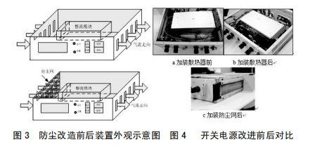 3.2在設備本體進風孔加防塵網,避免塵土進入設備內部,設備維護人員定時對濾網間斷清掃,然后減輕元器件外表覆塵,利于設備正常散熱,如圖3所示加裝防塵網后開關電源標明圖。對設備施行上述改善后,其改善前后對比如圖4所示。