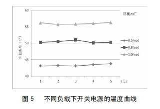 改善后,為考證改善作用,對開關電源分別在0.5倍、0.8倍及1.0倍負載下間斷了為期5天的帶負荷實驗,圖5為不同負載下開關電源的溫度曲線,由圖5可知,跟著負荷的增大,開關電源問題整體呈上升趨向;負載不變的情況下,同一溫度曲線根柢堅持滑潤;開關電源在額定負載下作業,最高溫度不超越57℃,未達報警值,開關電源穩定性得到明顯前進。